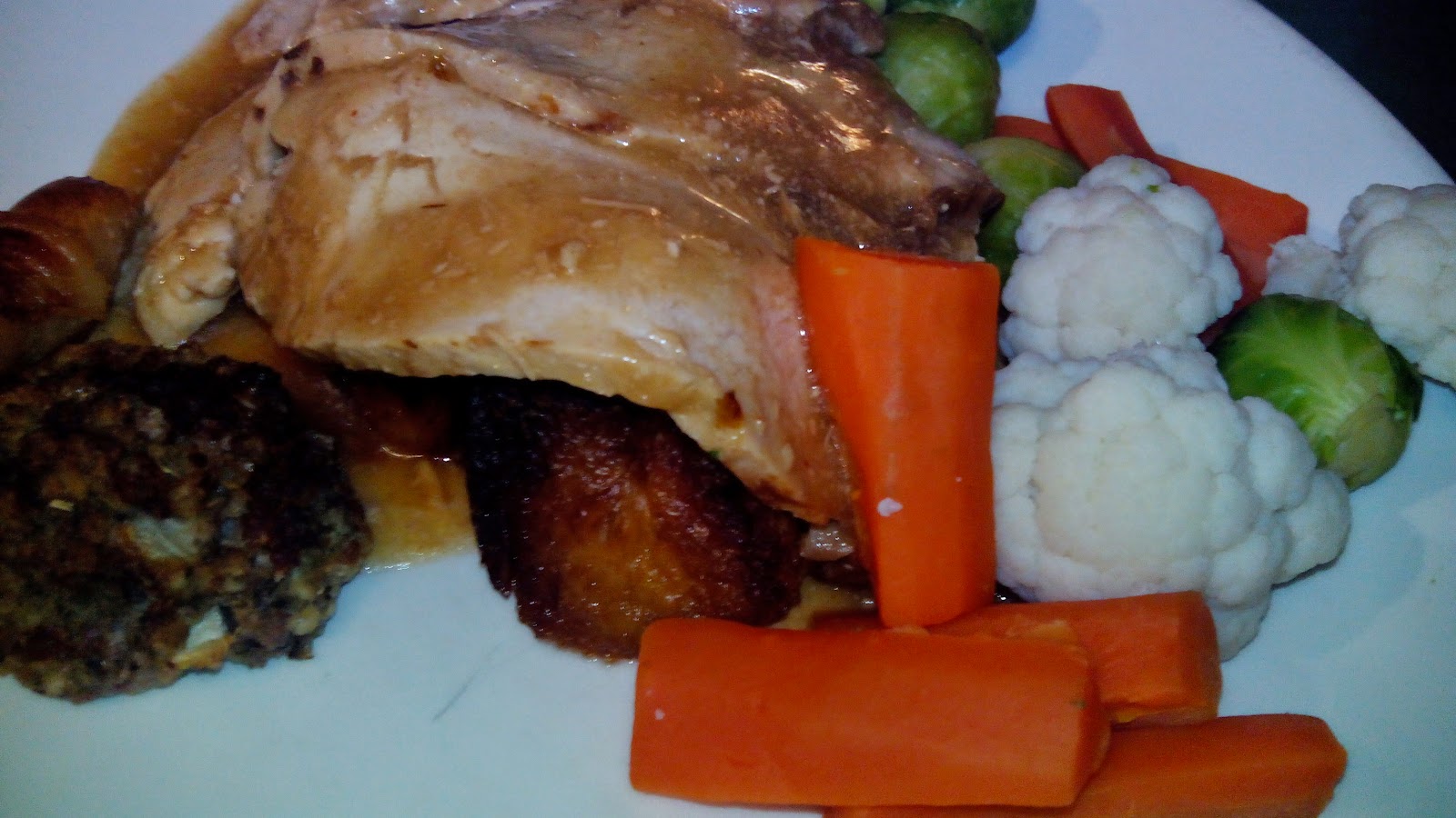 | The roast turkey as my main course. The vegetables looked good but tasted hard. the sutffing and pigs in blankets was nice :) |